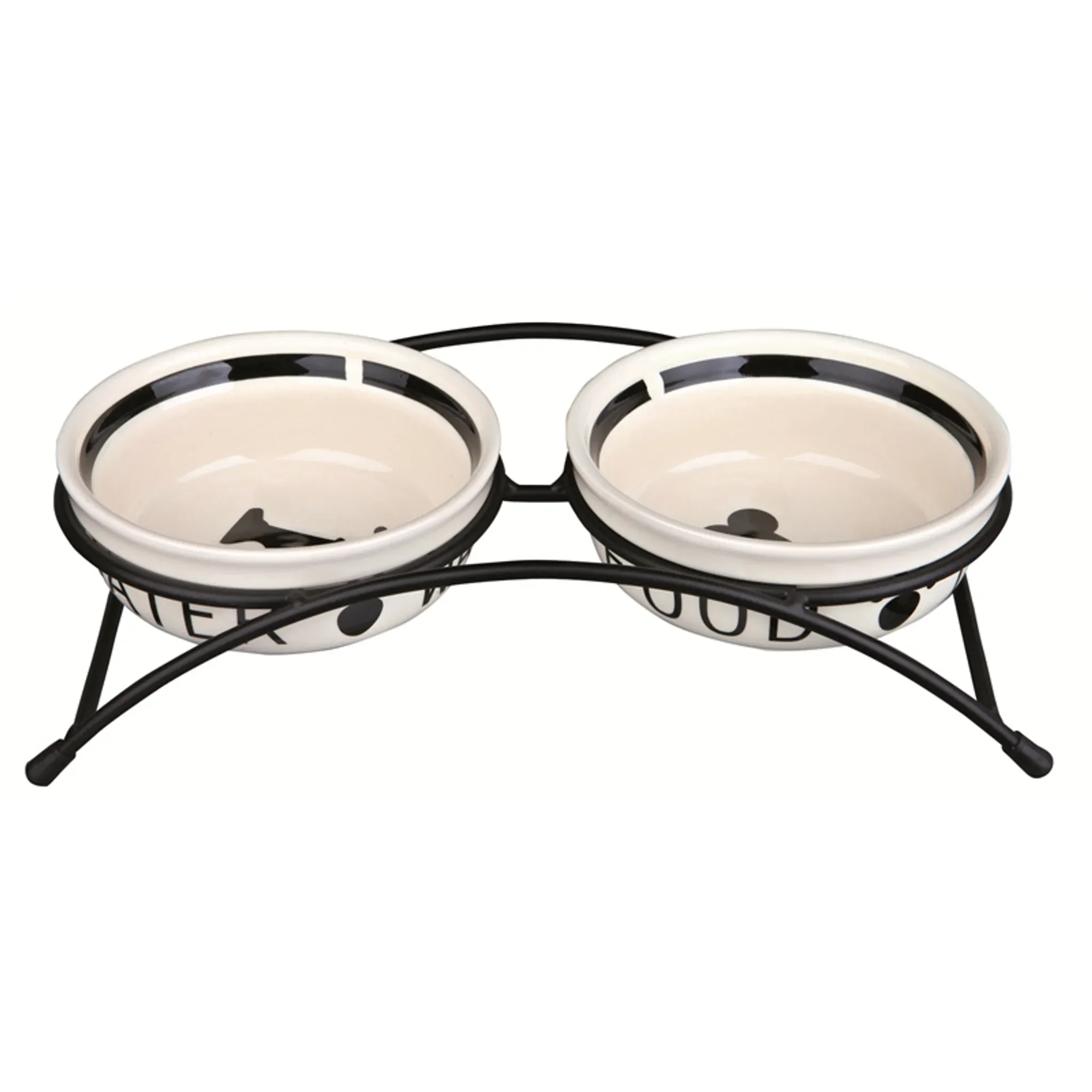 Highlights: Stilvolles Napf-Set mit klarer Kennzeichnung für Futter und Wasser, stabiler Metallhalter, rutschfester Stand durch Gummifüße, pflegeleichte Keramiknäpfe für den täglichen Gebrauch.