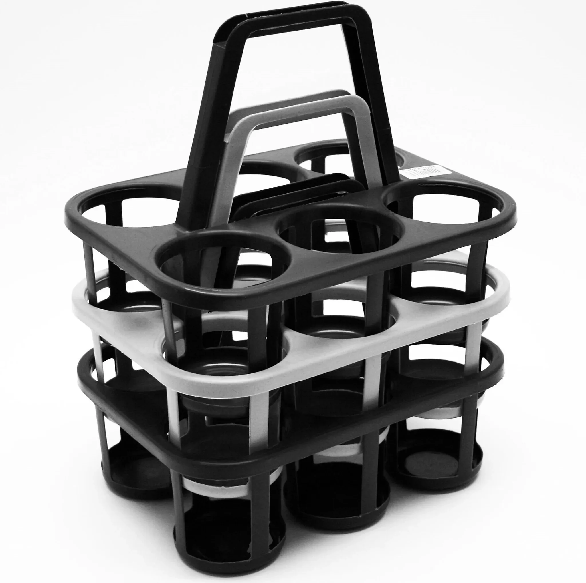 Die Konstruktion ist stapelbar, sodass mehrere Träger platzsparend gelagert werden können. Geeignet für Flaschen mit einem Fassungsvermögen bis zu 1,5 Liter. Die Lieferung erfolgt farblich zufällig in Schwarz oder Grau.